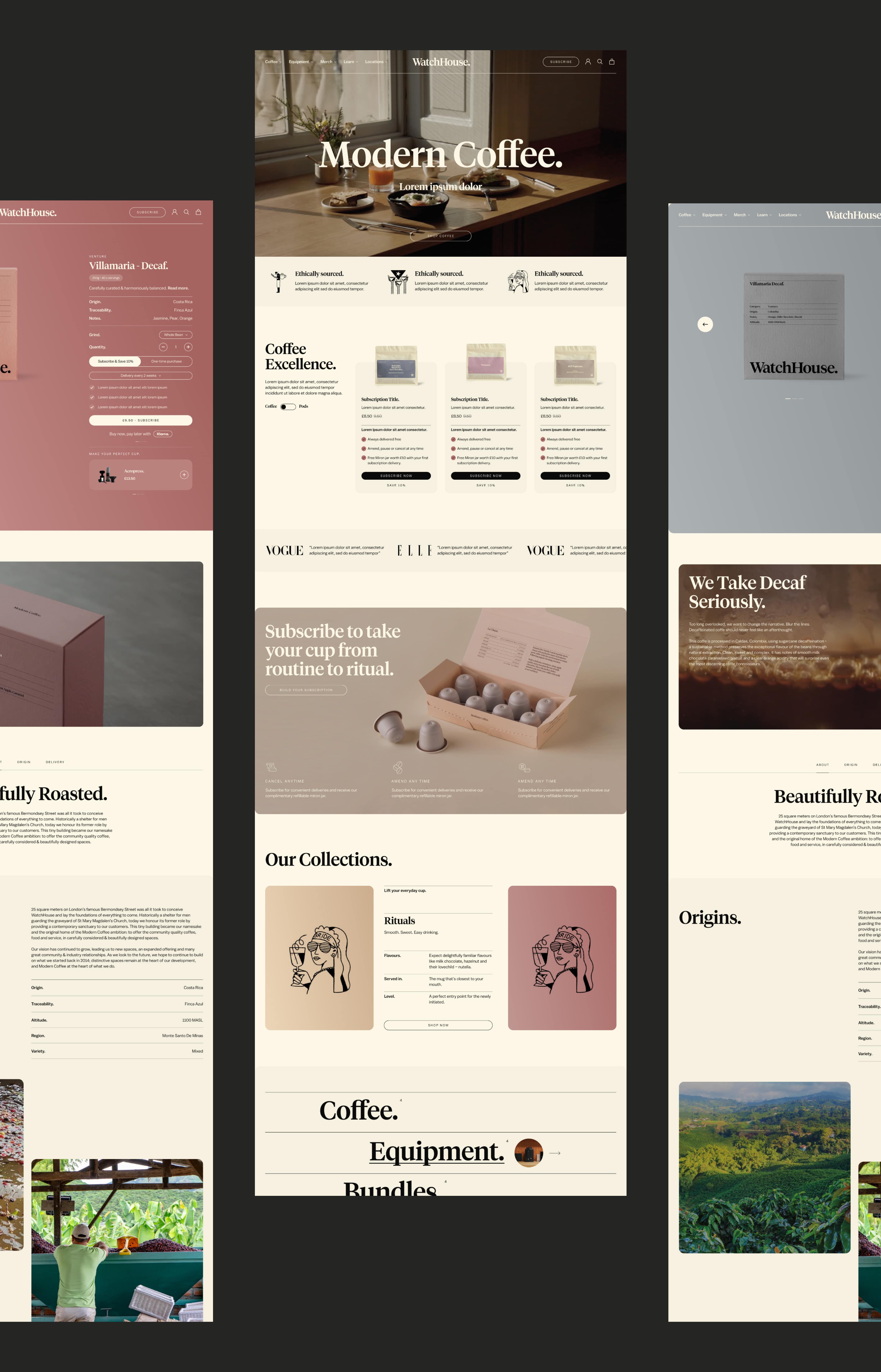 As Lead Designer, I completely redesigned WatchHouse’s website, transforming it into a premium and distinctive digital experience. The new site not only showcases the elegant WatchHouse brand but also tells the story behind WatchHouse, its “Modern Coffee” ethos, and their origin.